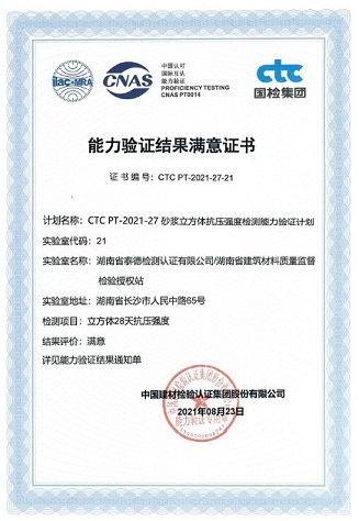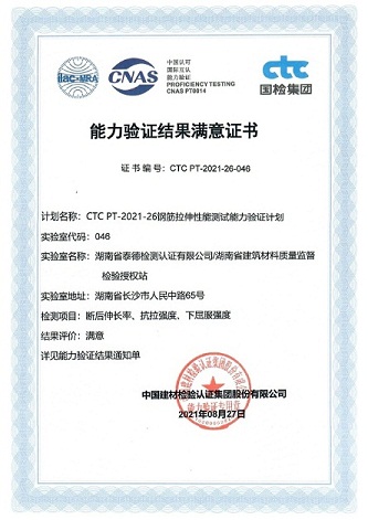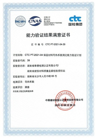 近日,湖南省泰德檢測(cè)認(rèn)證有限公司(以下簡(jiǎn)稱(chēng)“泰德公司”)收到中國(guó)建材檢驗(yàn)認(rèn)證集團(tuán)股份有限公司(CTC)發(fā)布的能力驗(yàn)證結(jié)果通知單,保溫材料導(dǎo)熱系數(shù)、鋼筋拉伸性能和砂漿立方體抗壓強(qiáng)度的檢測(cè)能力驗(yàn)證獲“滿(mǎn)意”結(jié)果!