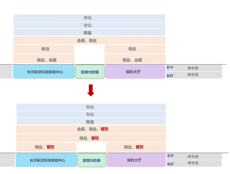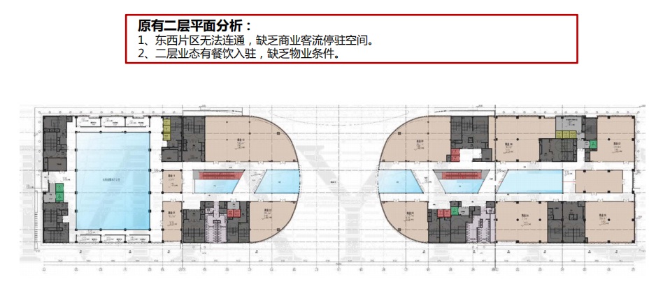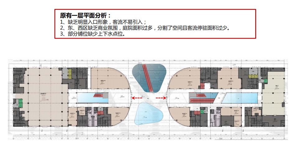 ①一層入口廣場增設(shè)景觀小品,烘托入口商業(yè)氛圍 ②二層中部增設(shè)連廊,加強(qiáng)商業(yè)東西貫通,增強(qiáng)商業(yè)氛圍,利于客流游逛